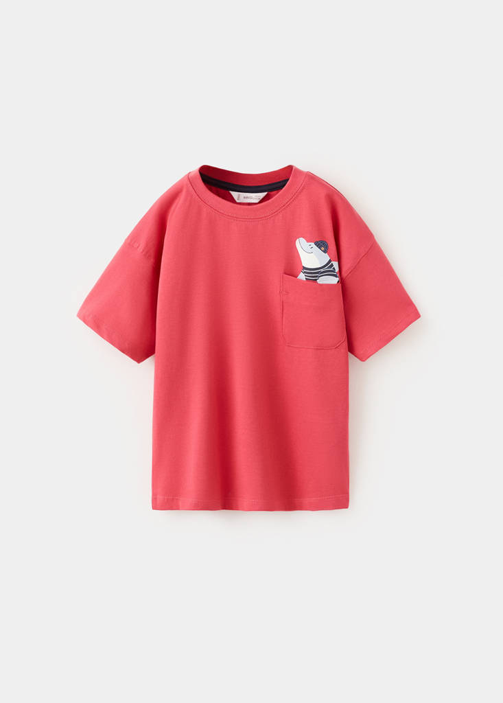 Teixit 100% cotó. Disseny recte. Coll rodó. Màniga curta. Dibuix estampat al pit. Detall butxaca pit. Text estampat a la part posterior