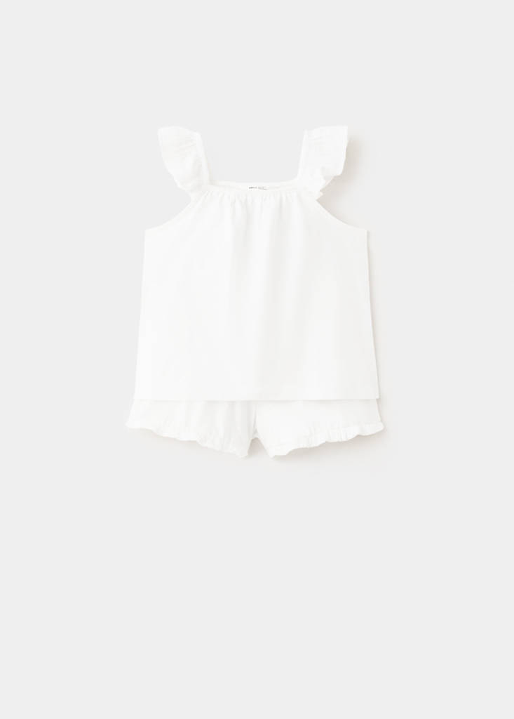 Pack de samarreta de màniga curta i pantalons curts de pijama. Teixit 100% cotó. Disseny recte. Volants als tirants. Pantalons curts. Cintura elàstica. Detall de volants a la vora