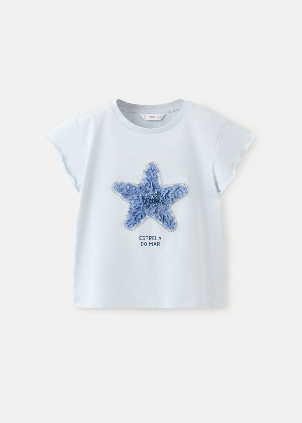 Teixit 100% cotó. Disseny recte. Coll rodó. Màniga curta amb volant. Text estampat al pit. Detall d'estrella.