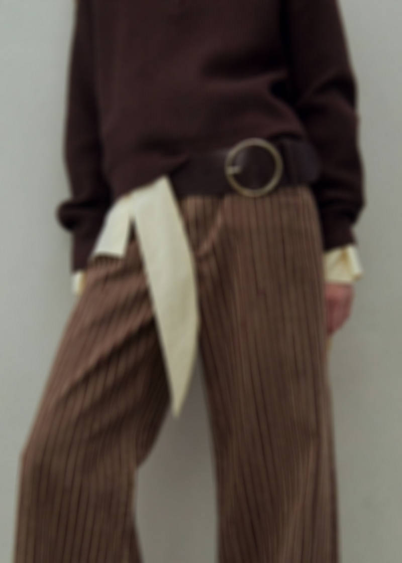 Teixit de cotó estil texà vaquer. Disseny wide leg. Estampat Ratlles. Tir mitjà. Trabelins. Cinc butxaques. Tancament de botó i cremallera