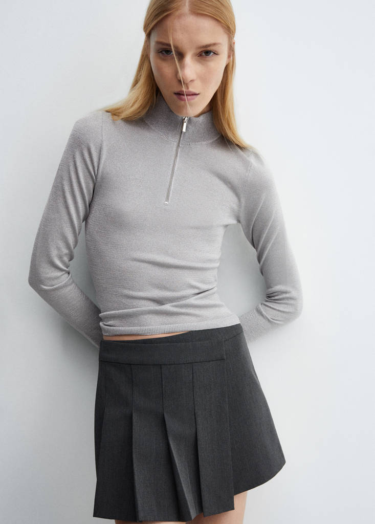Teixit de punt fi. Teixit de lúrex. Disseny recte. Coll Perkins amb tancament de cremallera. Màniga llarga. Acabats de canalé. Looks d'oficina