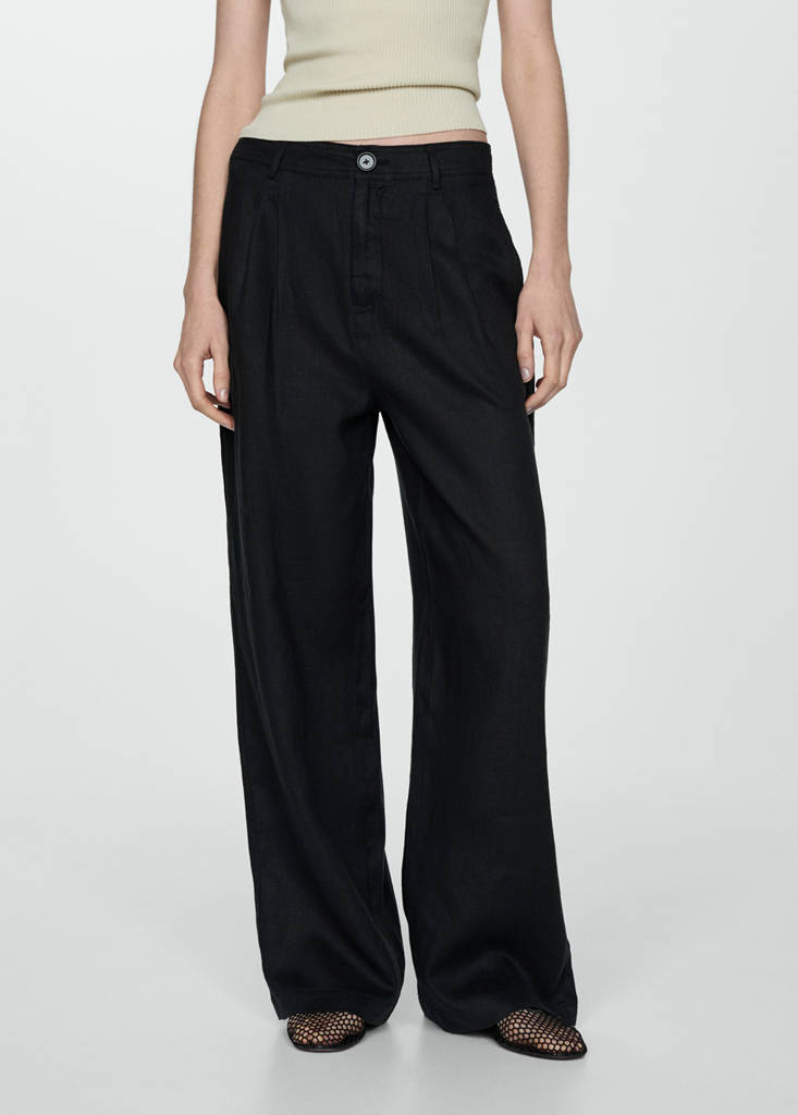 Teixit 100% lli. Disseny wide leg. Tir alt. Trabelins. Butxaques laterals. Tancament de cremallera i botó. Detall de pinces.