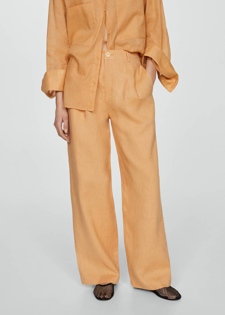 Teixit 100% lli. Disseny wide leg. Tir alt. Trabelins. Butxaques laterals. Tancament de cremallera i botó. Detall de pinces.
