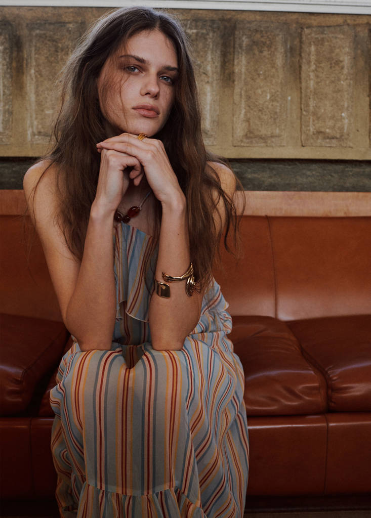 Disseny llarg. Disseny recte. Estampat de ratlles. Detall de volants. Detall de granadures al coll. Coll hàlter. Sense mànigues. Tancament de cremallera a la part posterior. Folre interior