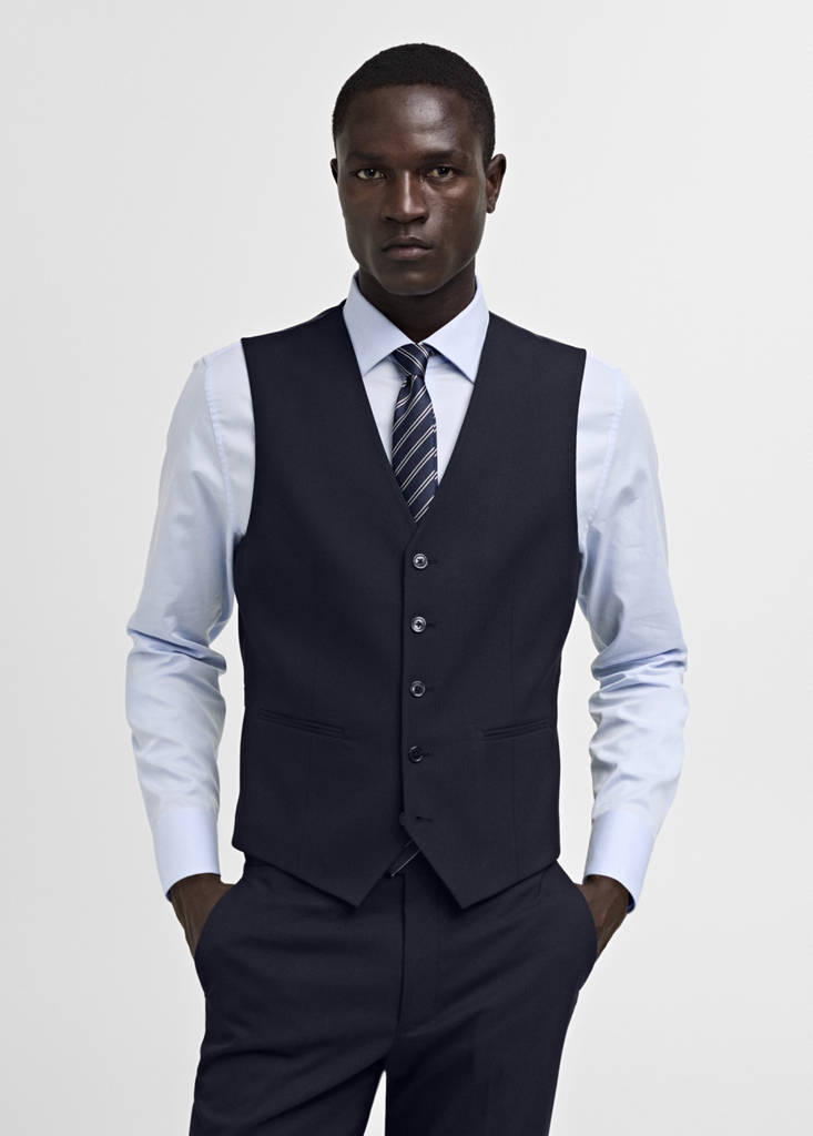 Slim fit. Confeccionat de polièster reciclat, una fibra resistent, transpirable i de fàcil cura, que aporta comoditat en l'ús. Comfort Stretch: Teixit elàstic que aporta un plus de comoditat. Coll en punta. Sense mànigues. Sivella ajustable a l'esquena. Folre interior. Butxaca interior. Col·lecció sastreria. Dues butxaques de rivet a la part davantera. Tancament davanter amb botons. Comfort: Aquesta peça li ofereix total llibertat de moviments i recupera la seva forma original.