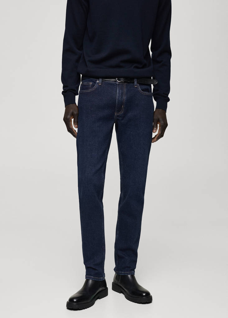 Slim fit. Teixit de cotó. Tir mitjà. Rentat fosc. Travetes per a cinturó. Tancament de cremallera i botó. Dues butxaques laterals. Butxaca moneder. Dos butxaques de pedaç a la part posterior.