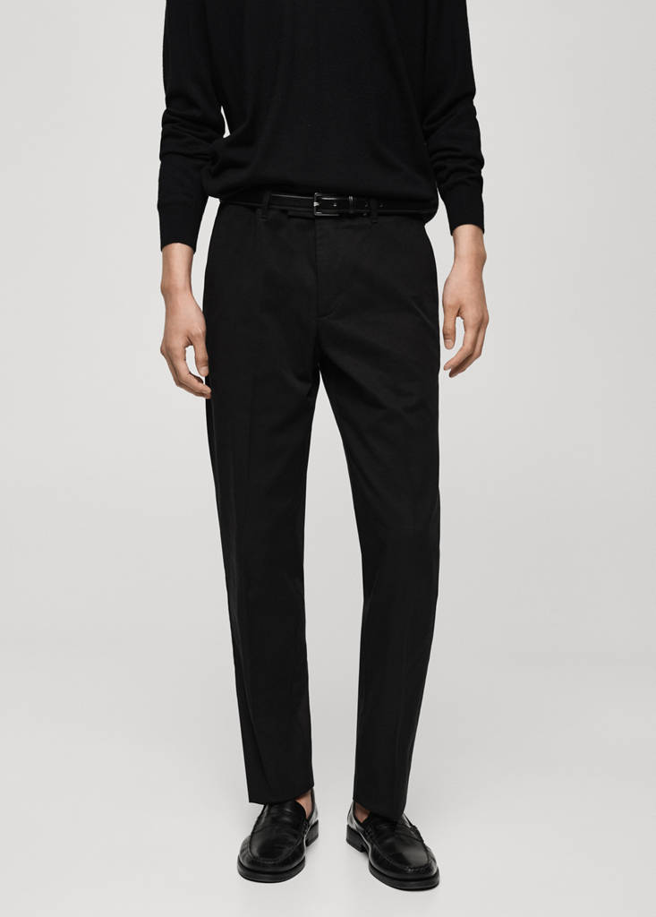 ESSENTIALS: Fets per durar. Regular fit. Teixit de cotó. Tir mitjà. Detall de ratlla planxada a la part del davant i del darrere. Tancament davanter de botons i cremallera oculta amb tapeta. Travetes per a cinturó. Dues butxaques laterals. Dos butxaques de trau amb botó a la part posterior. Baix recte