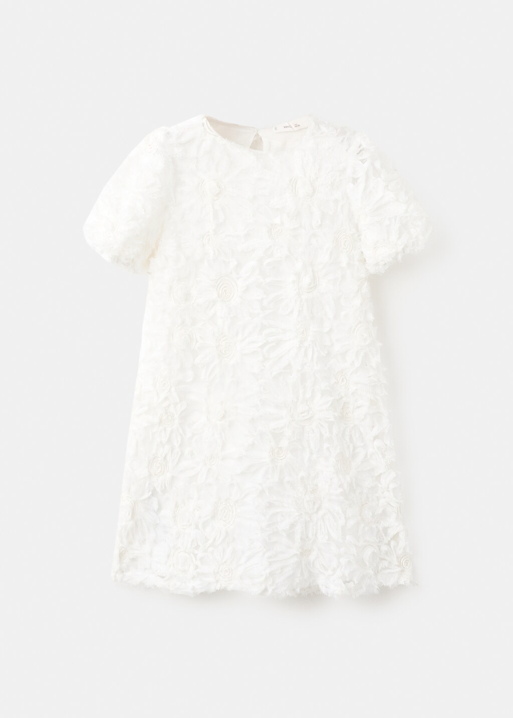 Llargada curta. Teixit de tul. Detalls brodats. Disseny curt. Coll rodó. Màniga curta. Tanca de llàgrima a la part posterior. Folre interior. Col·lecció cerimònia.