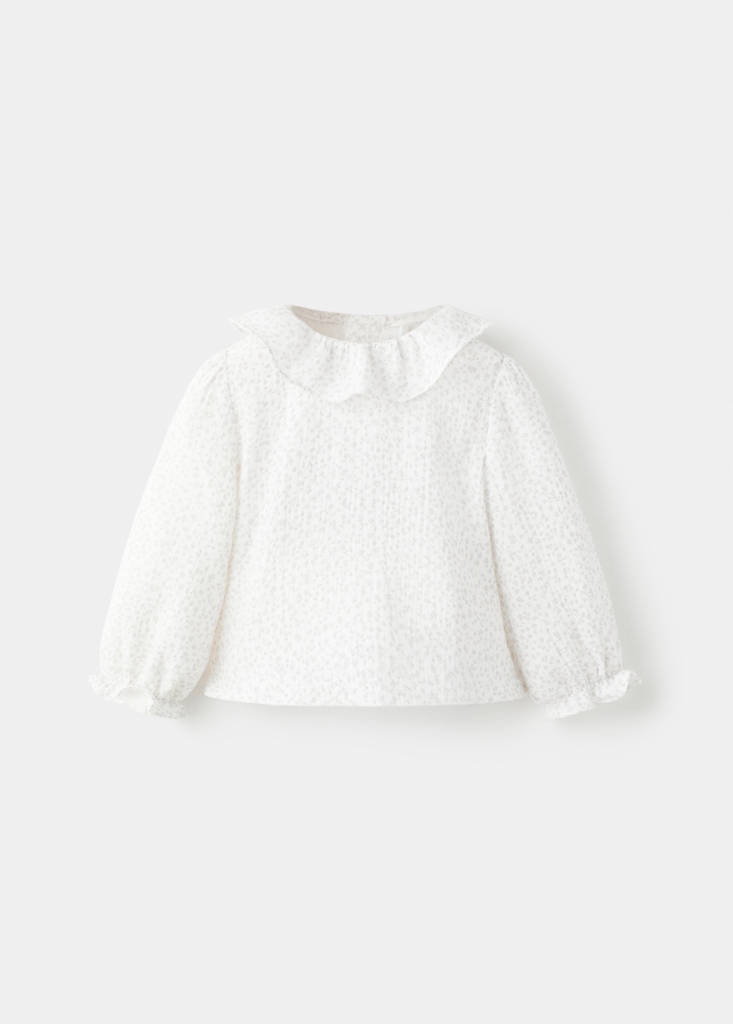 Teixit 100% cotó. Teixit de bambula. Disseny floral. Coll bebè. Tancament de botons a la part posterior. Màniga llarga amb punys elàstics i frunzits