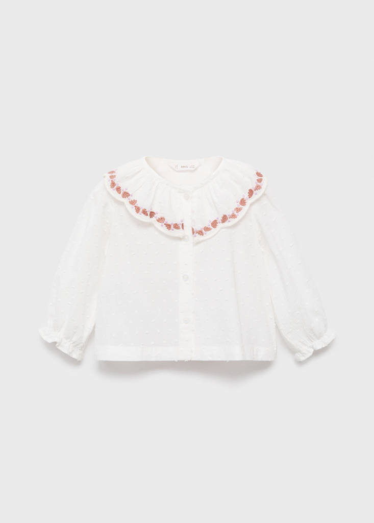 Teixit 100% cotó. Teixit plumeti. Disseny evasé. Coll babydoll. Màniga llarga amb punys elàstics i frunzits. Detalls brodats. Tancament davanter amb botons. Col·lecció Nadal