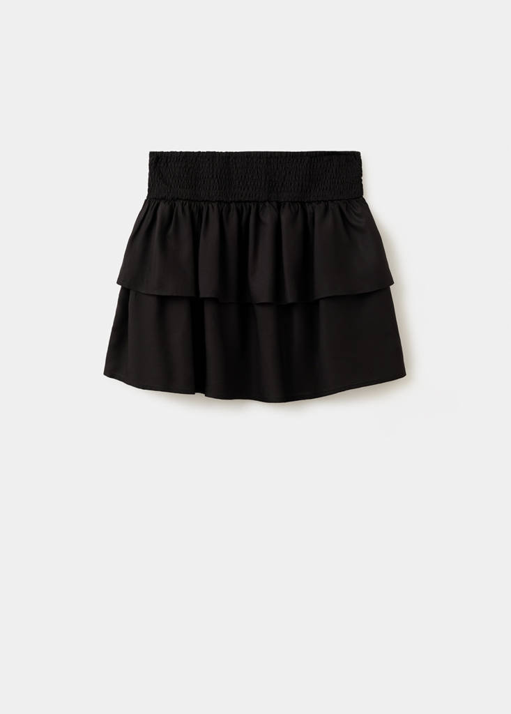 Teixit fluid. Disseny curt. Disseny evasé. Detall de volants. Panell arrugat a la cintura