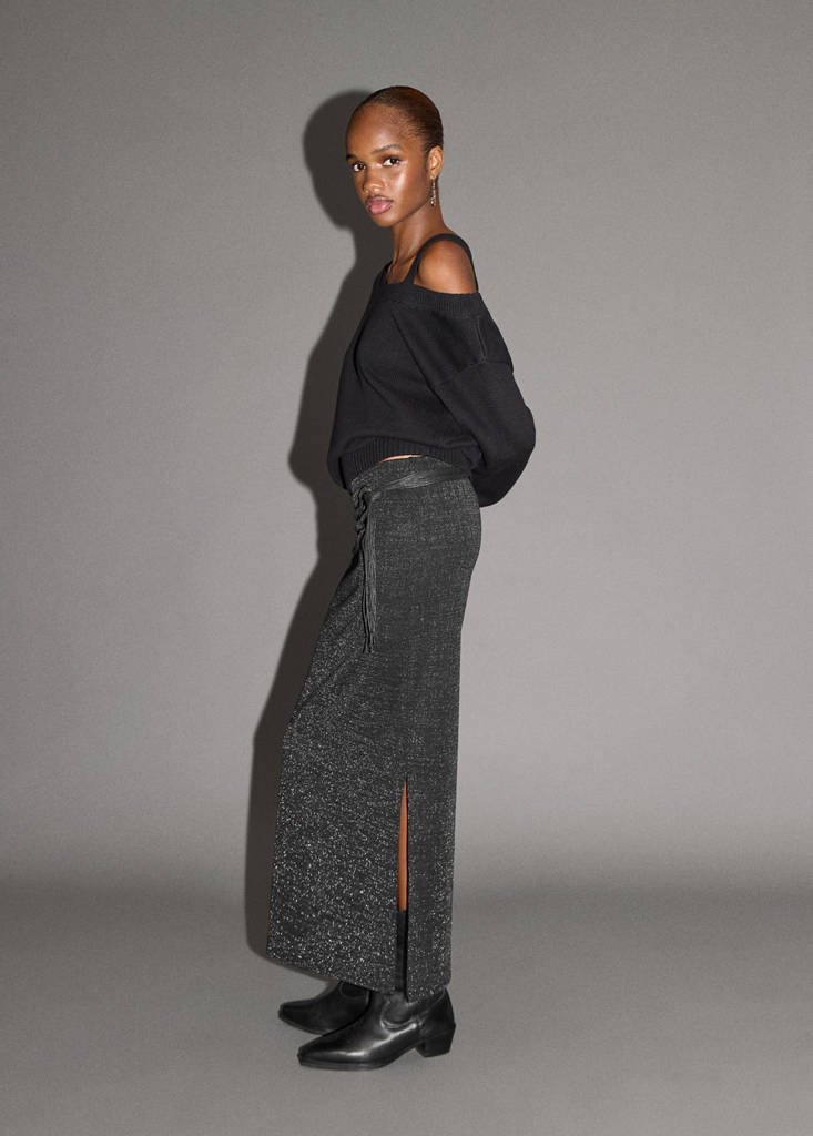Teixit de punt. Teixit de lúrex. Disseny llarg. Cintura elàstica. Obertura lateral. Col·lecció festa i esdeveniments. Party Collection. Col·lecció Nadal. Disseny brillantor.