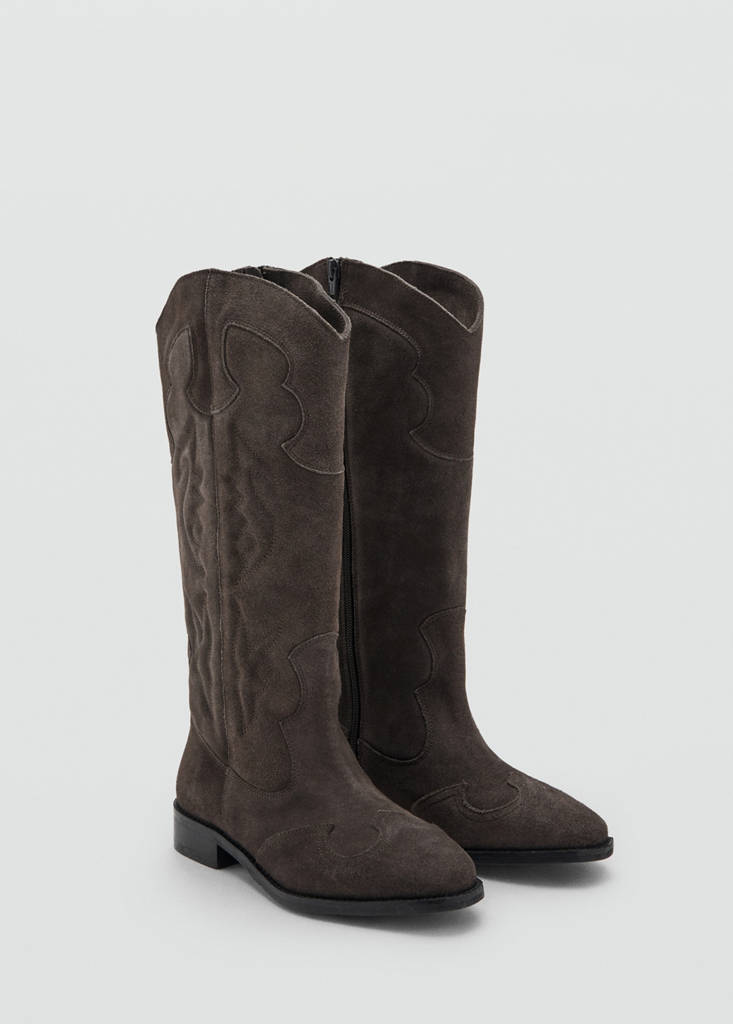 100% pell bovina. Canya alta. Punta fina i semirodona. Estil cowboy. Tanca lateral de cremallera. El taló mesura 3 cm.