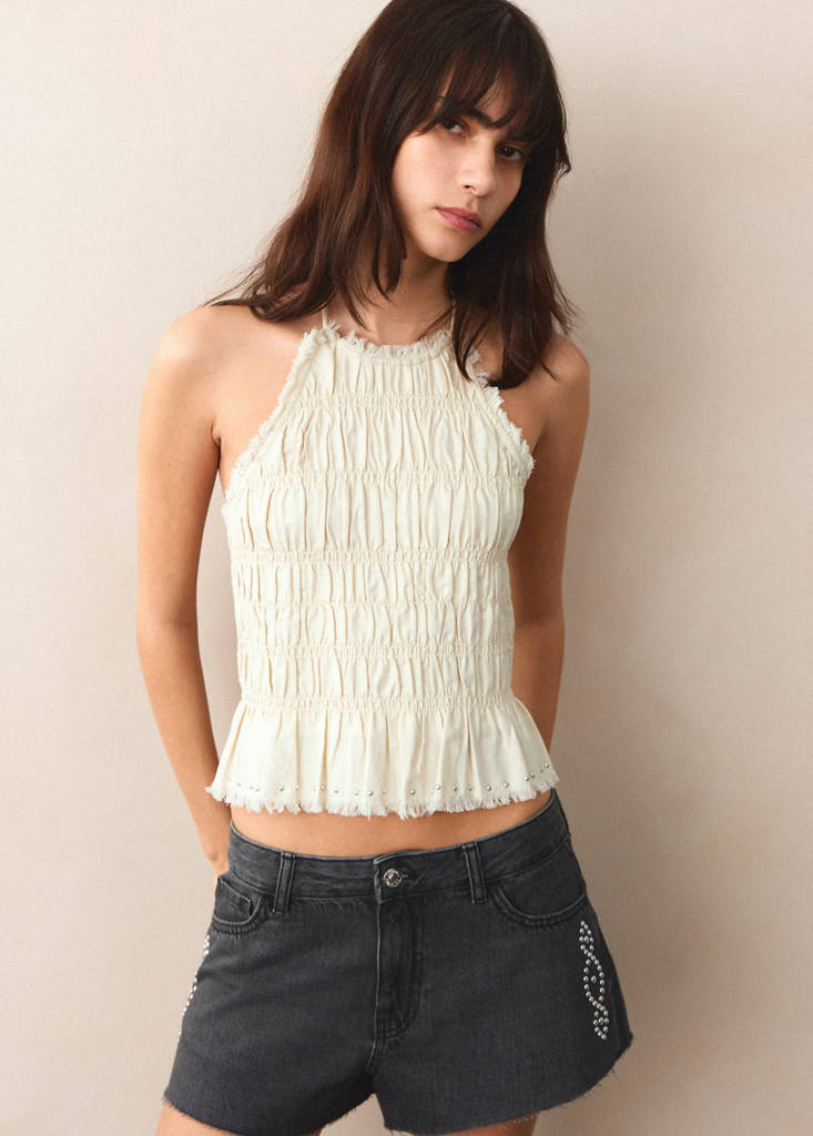 Teixit 100% cotó. Coll hàlter. Detalls frunzits. Esquena oberta. Costura amb detall de serrells. Total look