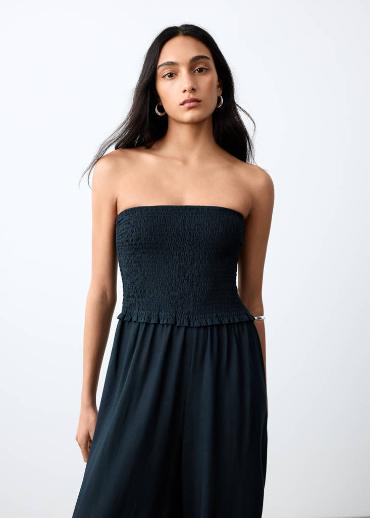 Teixit fluid. Disseny bufó. Disseny balloon. Disseny llarg. Paraula d'honor. Detall frunzit al pit. Vora elàstica. Detall de llaços a la vora