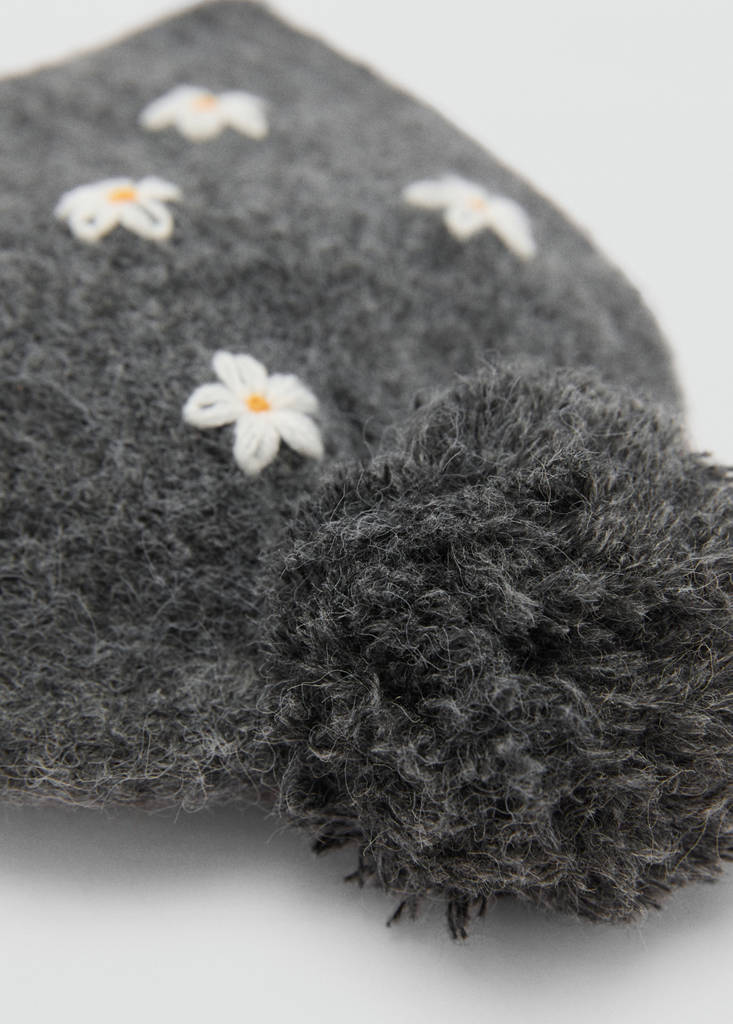 Tejido con lana. Microflores bordadas. Detalle de pompón