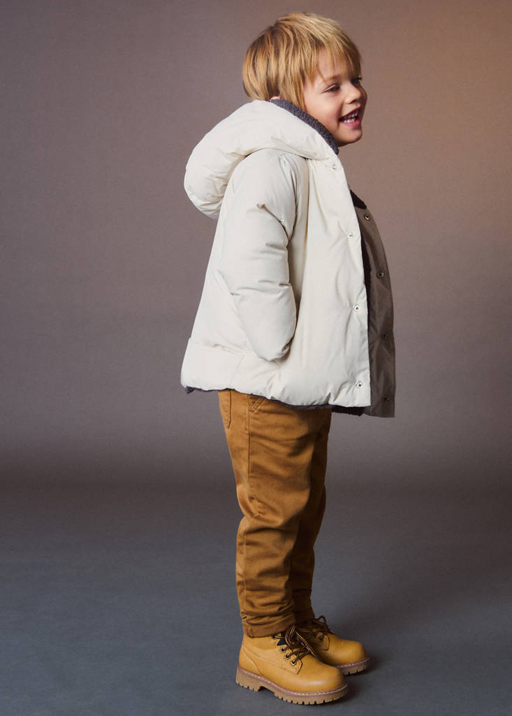 Diseño acolchado. Interior de borreguito. Manga larga. Dos bolsillos laterales. Etiqueta interior para datos personales. Cierre de botones. Capucha. Diseño recto