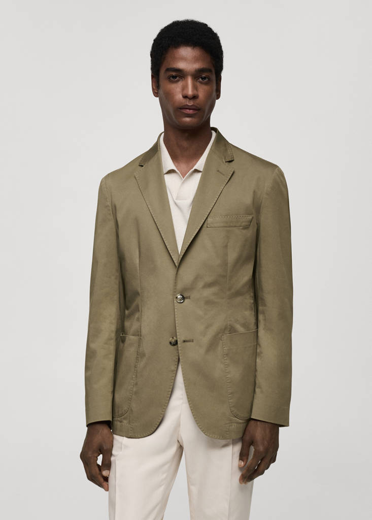 Slim fit. Tejido de algodón. Solapas de muesca y ojal. Cierre de dos botones en la parte delantera. Dos bolsillos de parche en la parte delantera. Manga larga con puños abotonados. Bolsillos interiores. Bajo recto. Forro interior parcial
