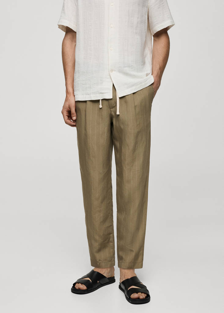 Tejido mezcla de lino y lyocell. Estampado de rayas. Detalle de pinzas delanteras. Trabillas para cinturón. Cintura elástica con cordón ajustable. Dos bolsillos delanteros. Dos bolsillos de ribete con botón en la parte posterior. Cierre delantero de cremallera y botón