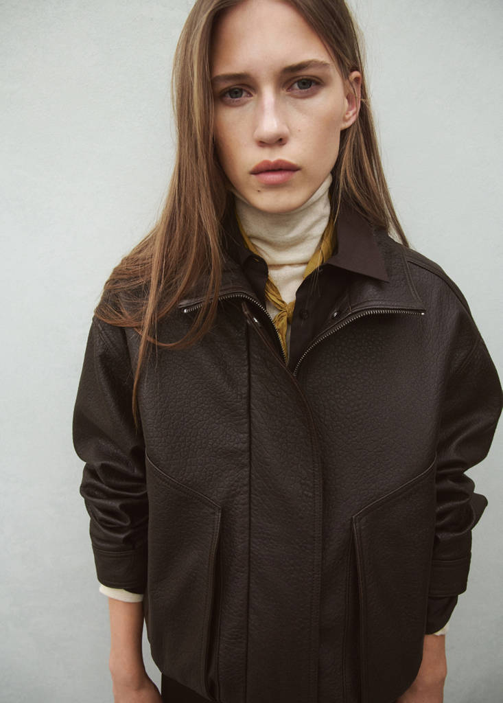 100% piel ovino. Diseño oversize. Cuello alto. Manga larga. Dos bolsillos de ribete laterales. Panel fruncido en la cintura. Cierre delantero de cremallera y botones a presión oculto con tapeta. Forro interior. Exclusivo Online. Colección Selection