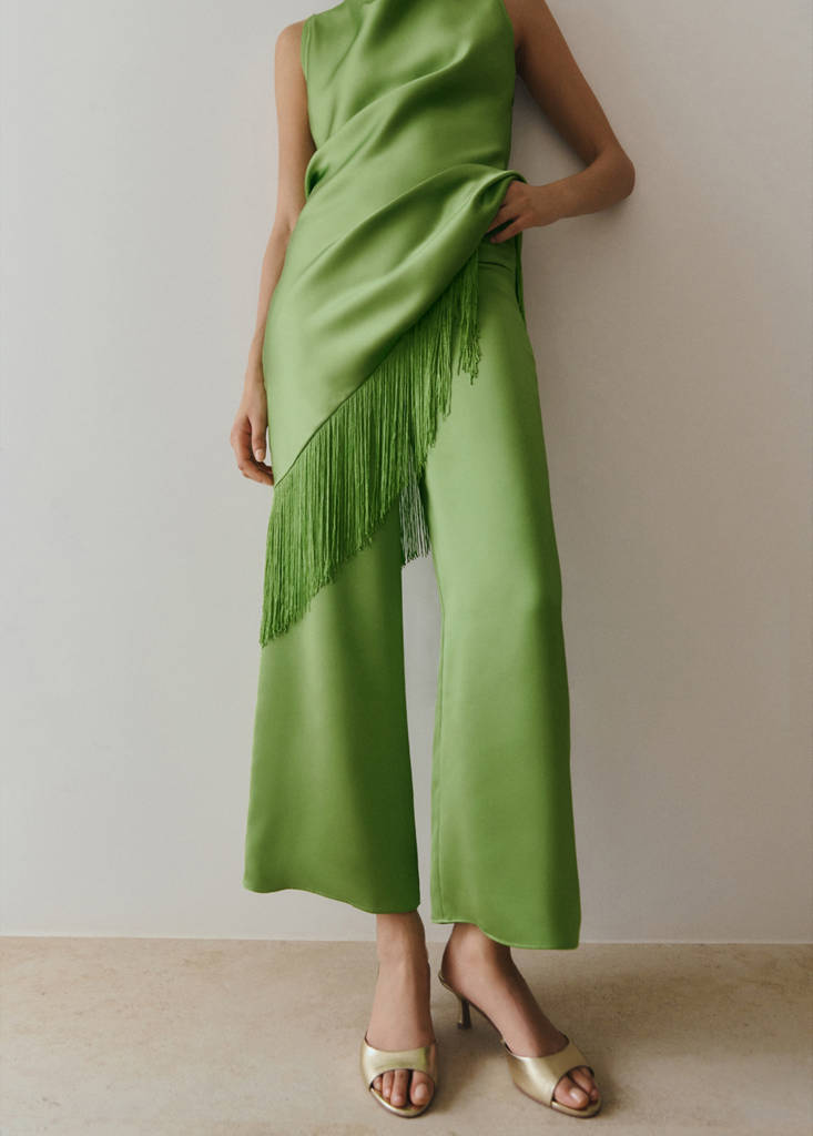 Tejido satinado. Diseño recto. Diseño largo. Tiro medio. Cierre de cremallera lateral. Total look. Esta prenda pertenece a nuestra colección de fiesta y evento, diseñada para elevar tus looks en ocasiones especiales
