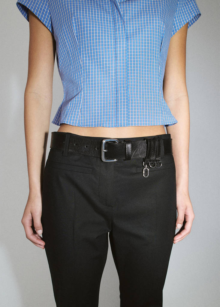 Tejido mezcla de algodón. Tejido con elasticidad. Tiro cintura Low Waist. Diseño recto. Diseño largo. Trabillas para cinturón. Dos bolsillos traseros de ribete. Cierre oculto de botón, gancho y cremallera