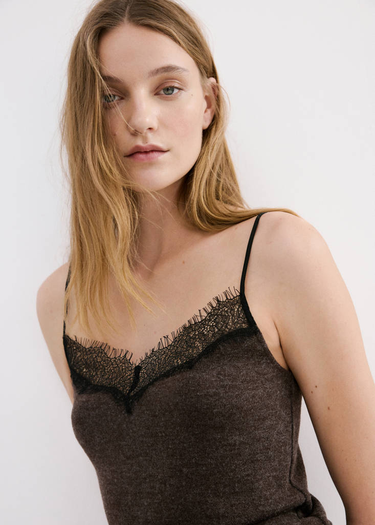 Top escote encajePrecio inicial tachado [€ 15,99 ]€ 15,99Precio actual [€ 9,99 ]€ 9,99-38 %Selecciona un colorChocolateLa modelo lleva la talla S y mide 179cm.Selecciona tu tallaXXSNo disponible ¡Lo quiero!XSNo disponible ¡Lo quiero!SNo disponible ¡Lo quiero!MLNo disponible ¡Lo quiero!XLNo disponible ¡Lo quiero!XXLNo disponible ¡Lo quiero!MedidasAñadirGuardar como favoritoVer lookEnvío gratis a tiendaDiseño recto. Escote de pico. Detalle encaje. Sin mangas. Tirantes finos ajustables. Sin cierreDetalles, composición y cuidadosDisponibilidad en tienda