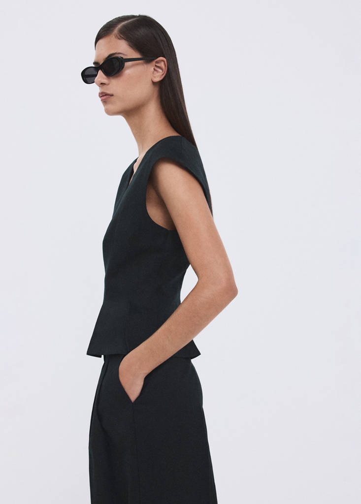 Tejido mezcla de lino. Diseño entallado. Corte peplum. Cuello pico. Sin mangas. Tirante ancho. Cierre de cremallera en la parte posterior. Total look.