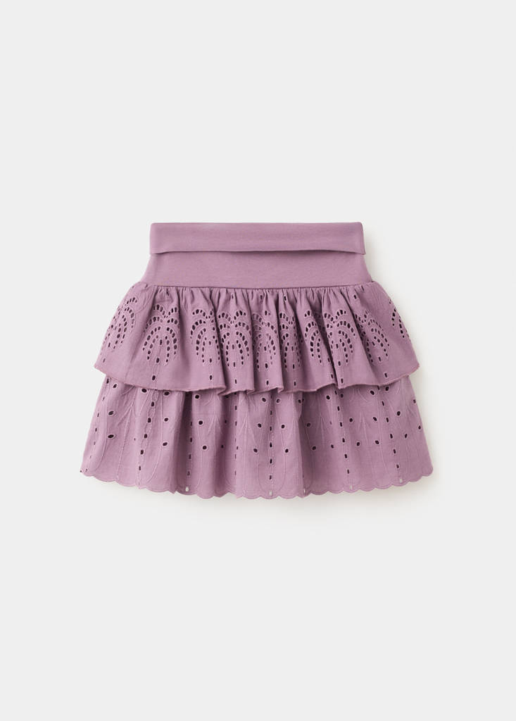 Confeccionada en tejido 100% algodón, esta prenda presenta un diseño corto y evasé. La cintura elástica con vuelta asegura comodidad, mientras que los detalles bordados calados añaden un toque distintivo. Incluye pantalón interior