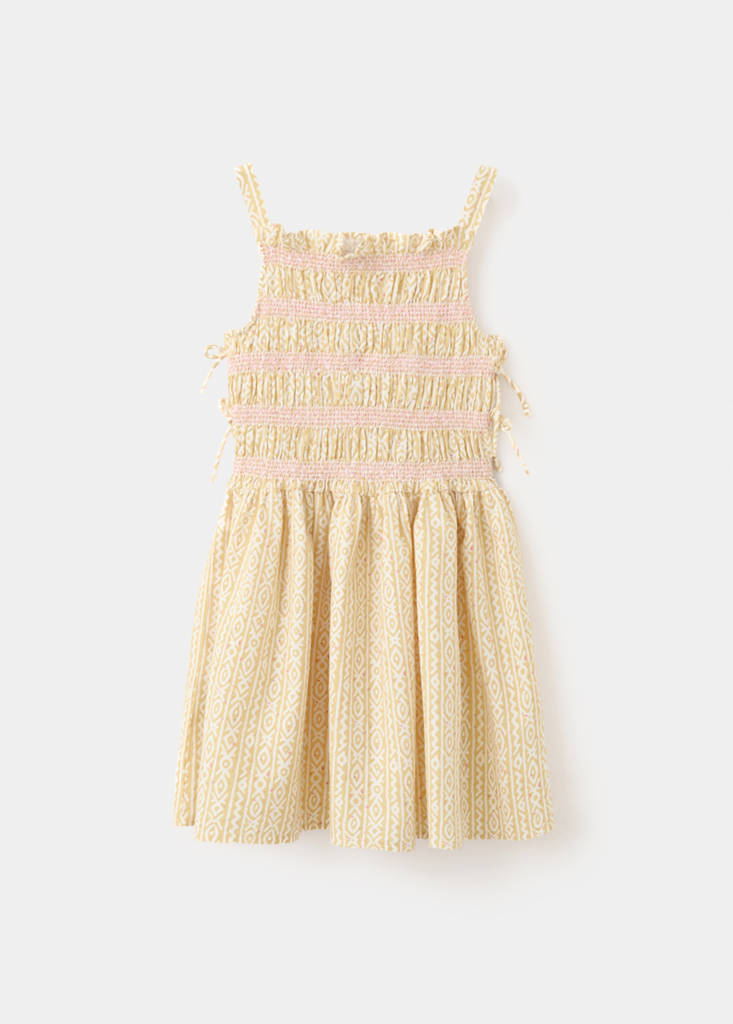 Tejido mezcla de algodón y lino. Diseño evasé. Diseño corto. Diseño estampado. Cuello recto. Tirantes. Detalles bordados en contraste. Detalle lazos en los laterales