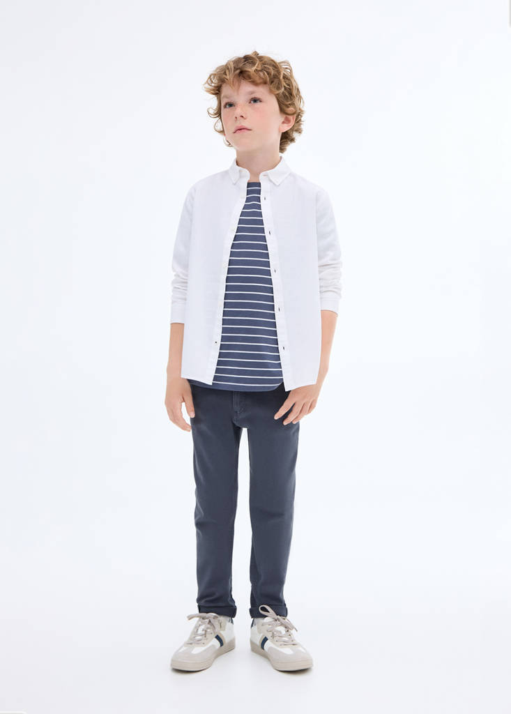 Tejido de algodón. Tejido elástico. Estilo tejano vaquero. Diseño largo. Diseño recto. Trabillas para cinturón. Cierre de botón y cremallera. Dos bolsillos laterales. Bolsillo portamonedas. Bajo con vuelta. Back to school
