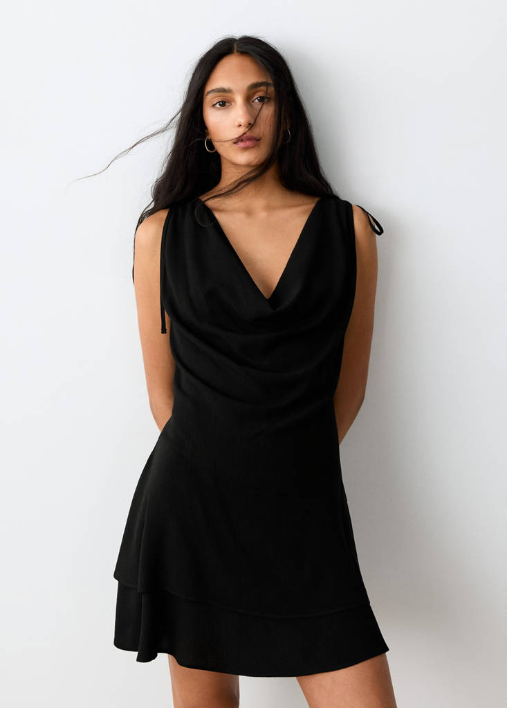 Tejido fluido. Diseño recto. Diseño corto. Cuello drapeado. Cierre de lágrima en la parte posterior. Cierre de cremallera lateral. Detalle de volantes en el bajo. Detalle de lazos en los hombros