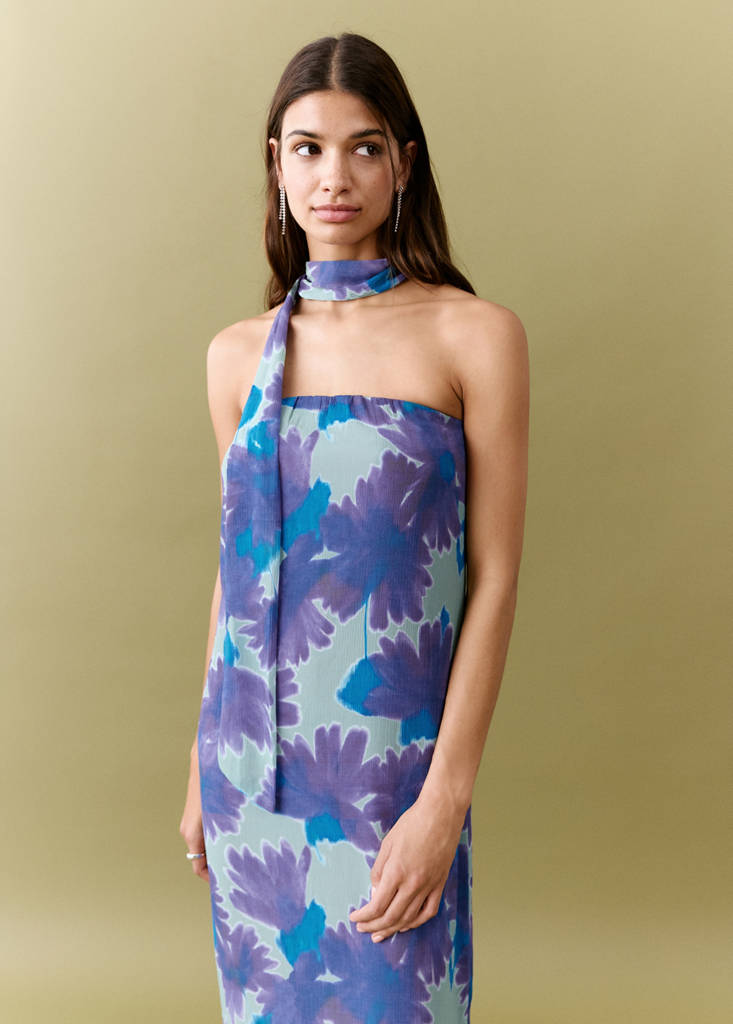 Tejido fluido. Diseño recto. Diseño largo. Palabra de honor. Adorno de fular en el cuello. Detalle de abertura lateral en el bajo. Colección fiesta y eventos.