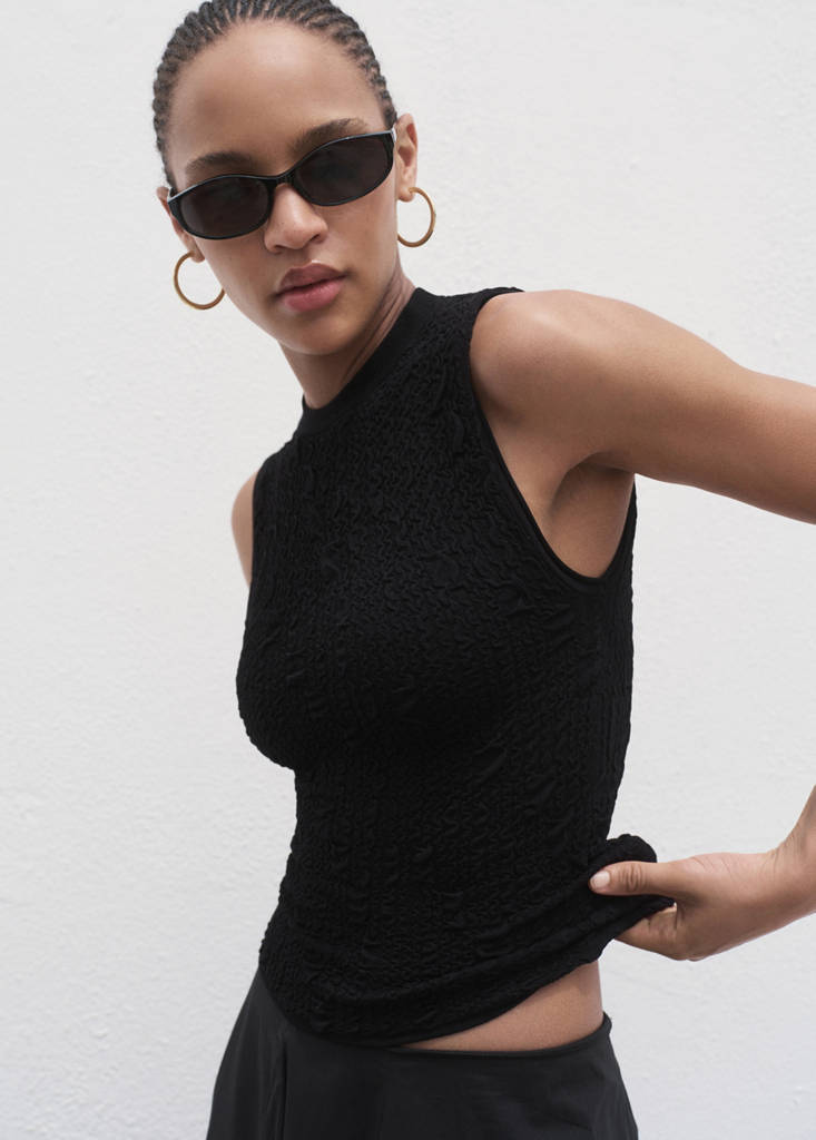 مصنوع من قماش الكريب، يتميز هذا التصميم الضيق برقبة دائرية وأشرطة عريضة.