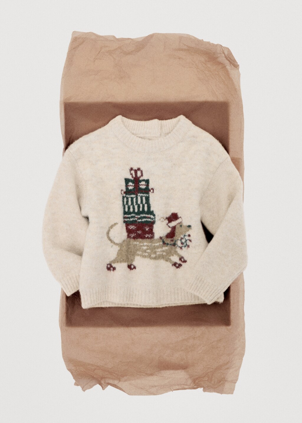 حياكة محبوكة. تصميم Puppy. تصميم مطرز. مطرزة بالكريسماس. ياقة وأساور وحافة مضلعة. ياقة دائرية. أكمام طويلة. مجموعة الكريسماس.