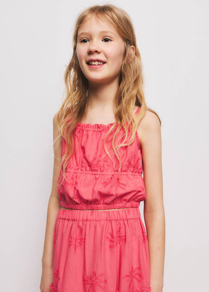 مصنوعة من قماش 100% قطن، تتميز هذه القطعة بتصميم مستقيم وياقة مستقيمة وحمالات. تضيف التفاصيل المطرزة لمسة مميزة