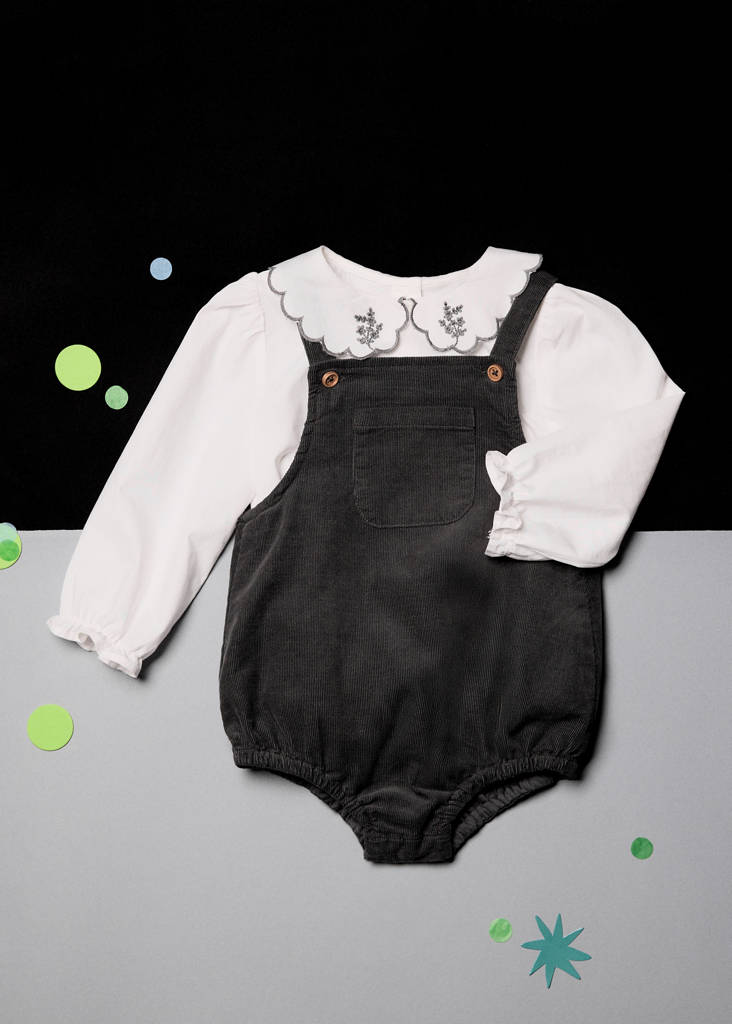 نسيج 100% قطن. تصميم إيفازي. ياقة بابيدول. تفاصيل مطرزة بالزهور. إغلاق بأزرار في الخلف. أكمام طويلة بحواف مضلعة. مجموعة عيد الميلاد