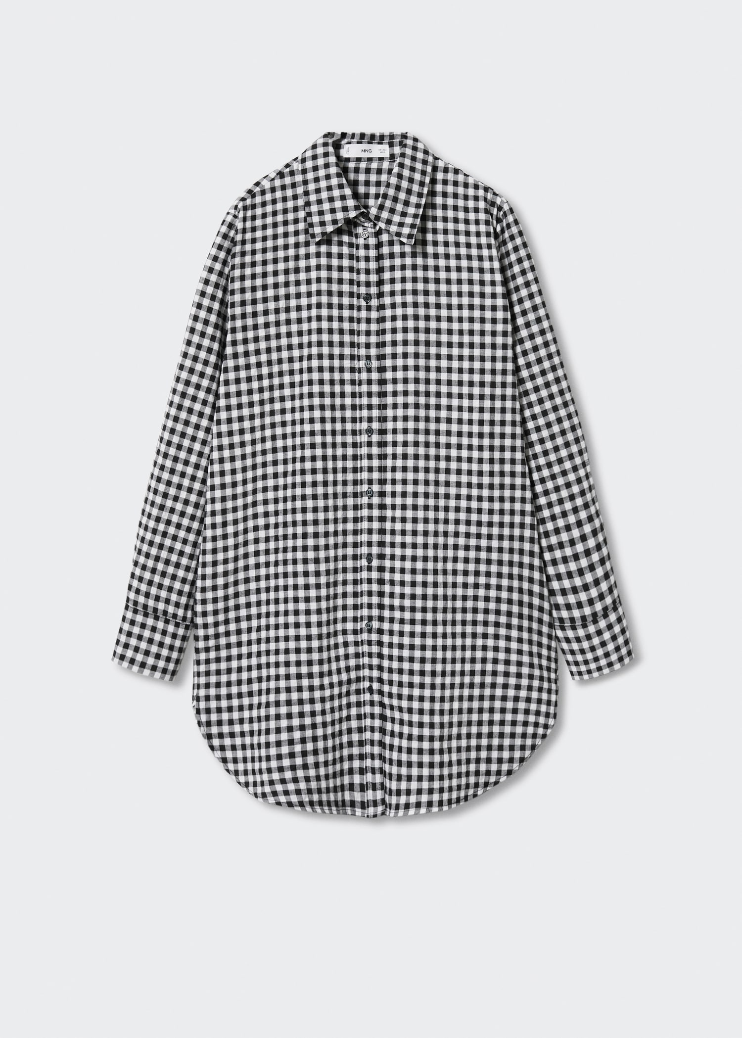 نسيج بمزيج قطني. نسيج واسع. تصميم قصير. طبعات من الجبهام المربعات. ياقة قميص. إبزيم بزر في الجزء الأمامي. أسورة بأزرار. الأكمام الطويلة. إطلالة كاملة.