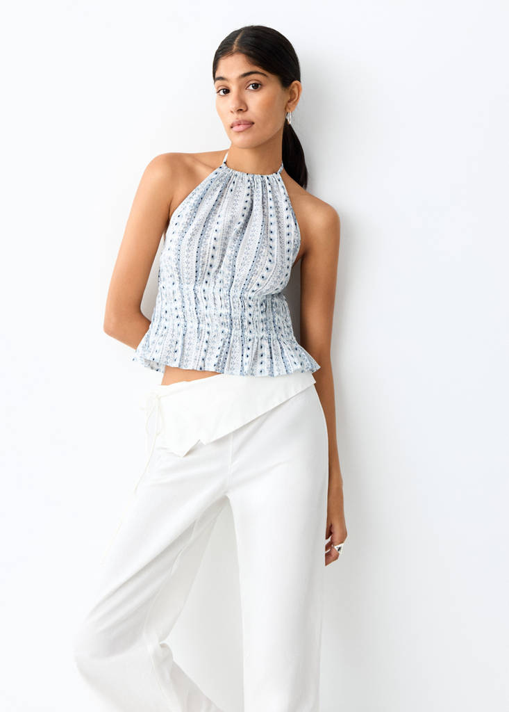 نسيج 100% قطن. تصميم مستقيم. تصميم مطبوع. ياقة هالتر. إبزيم بأنشوطة على الرقبة. ظهر مفتوح. Total look