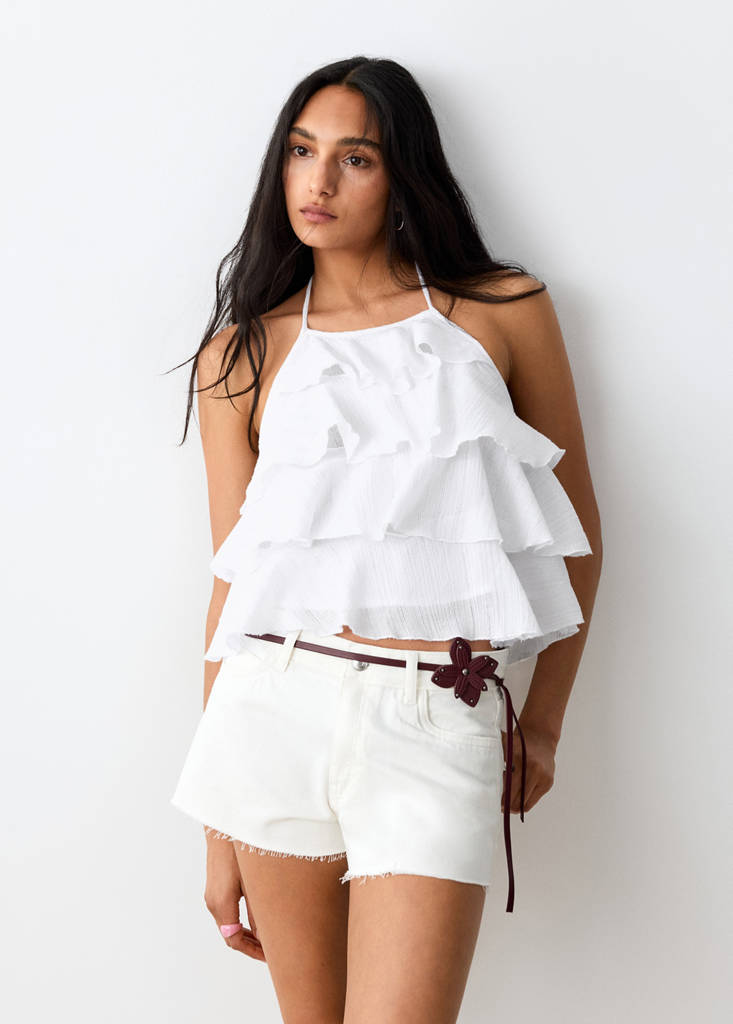 نسيج قطني. تصميم مستقيم. ياقة هالتر. ظهر مفتوح. إبزيم بأنشوطة على الرقبة. تفاصيل الكشكش