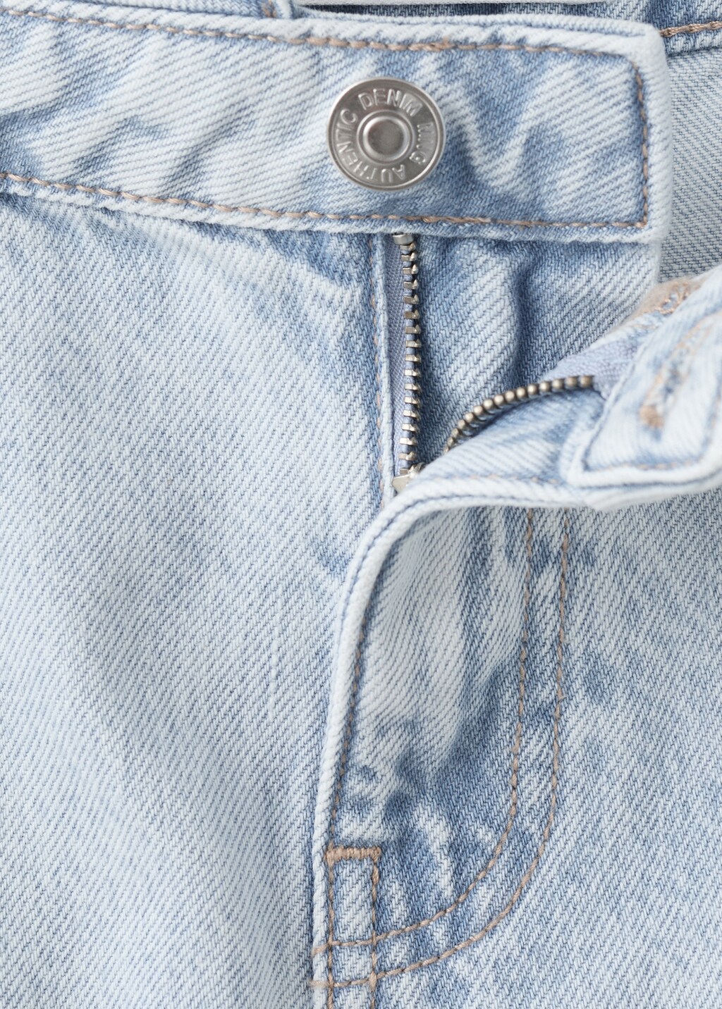 نسيج قطني بأسلوب الدنيم الجينز. تصميم مستقيم. تصميم قصير. تفاصيل مطوية. خمسة جيوب. إغلاق بسحاب وزر.