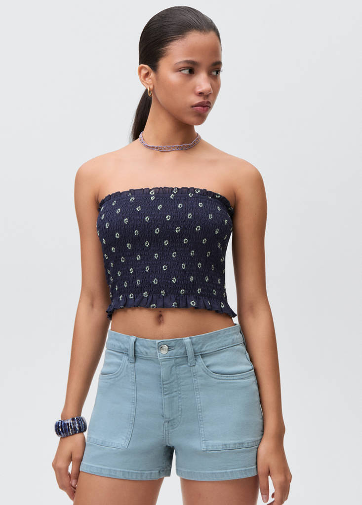 نسيج قطني. نسيج مطاطي. نمط الجينز. تصميم مستقيم. تصميم قصير. حلقات للحزام. إغلاق بسحاب وزر. جيبان جانبيان. جيبان على شكل رقعة في الخلف