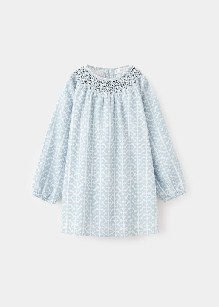 100% cotton fabric. Straight design. Short design. Gathered round neckline. Contrast collar. Long sleeves with elastic cuffs. Teardrop fastening at back. Valentine Collection