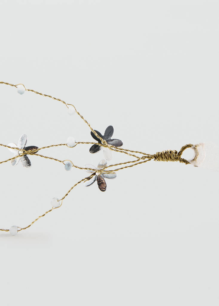 Metallic design. Mesh design. Floral design. Rhinestone detail. Tie fastening. Ceremony collection. Party, ceremony and guest collection