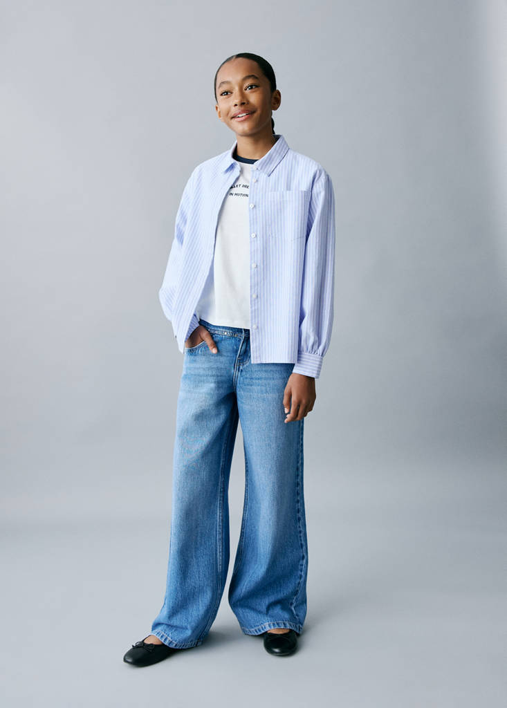 100% cotton fabric. Stripe design. Shirt collar. Long sleeves. Cuffs with flap and button. Ruched detail on the cuffs. Front closure with buttons