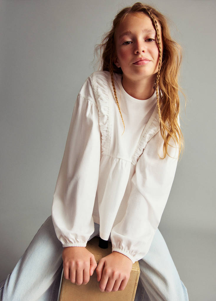 T-shirt with gathered detailsCurrent price [AED 109.00 ]AED 109.00Select a colourOff WhiteSelect your size5-6 years (116cm)Not available. I want it!7-8 years (128cm)Not available. I want it!9-10 years (140cm)Not available. I want it!11-12 years (152cm)Not available. I want it!13-14 years (164cm)Not available. I want it!DimensionsNotify meAdd to WishlistSee lookConvenient home delivery100% cotton fabric. Straight design. Ruched details. Round neck with button closure. Long sleeves with elastic cuffsDetails, composition and careStore availabilityItem qualitiesRecycled cottonAt least 20%This fibre is obtained from pre- and post-consumer textile waste that is transformed into new fabrics.