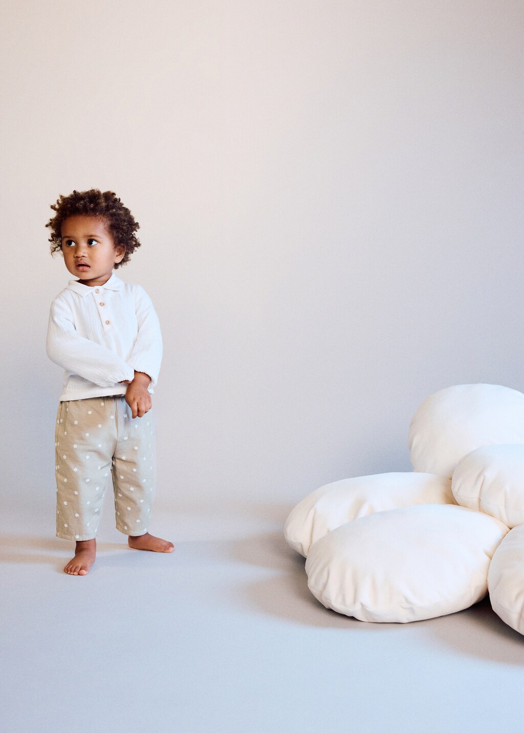 100% cotton fabric. Stretch fabric. Straight design. Long design. Elastic gathered waist. Flowered embroidery.