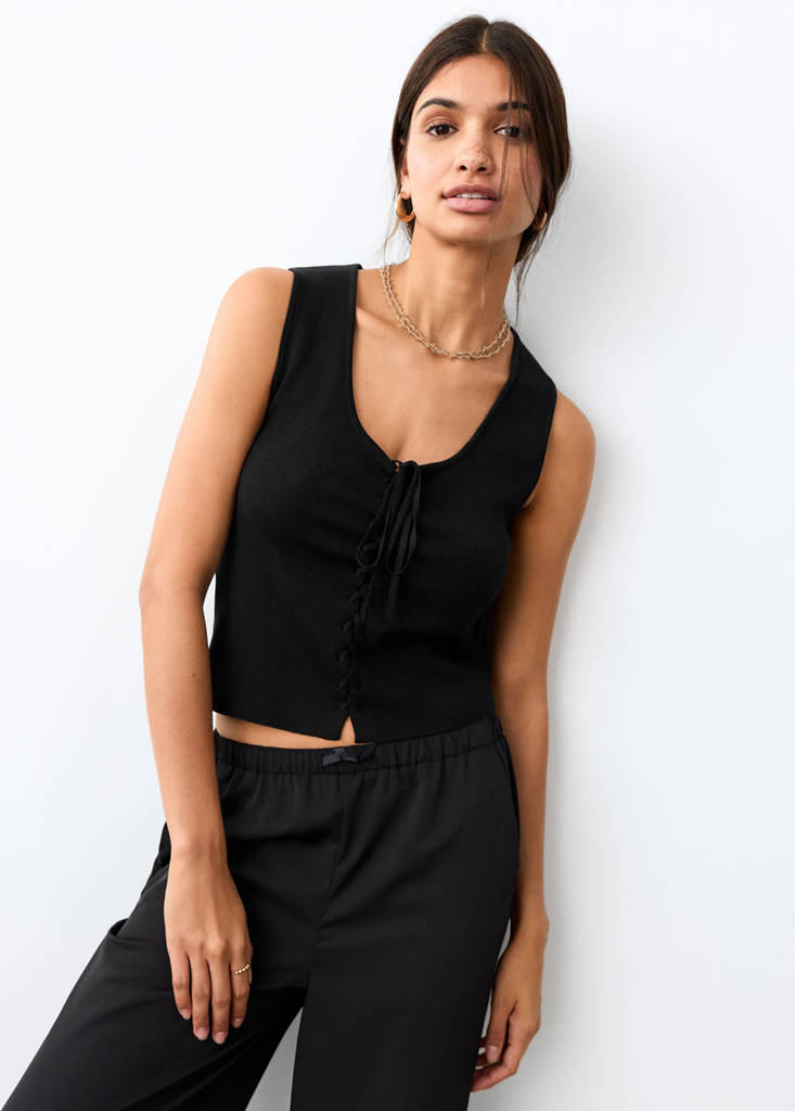 Top with bow closureCurrent price [AED 119.00 ]AED 119.00Select a colourBlackSize change - Consult the Size GuideSelect your sizeXXSDelivery in 7 to 10 working daysXSDelivery in 7 to 10 working daysSDelivery in 7 to 10 working daysMDelivery in 7 to 10 working daysLNot available. I want it!AddAdd to your wishlistSee lookConvenient home deliveryKnitted fabric. Straight design. Round neck. Tie fasteningDetails, composition and careStore availability
