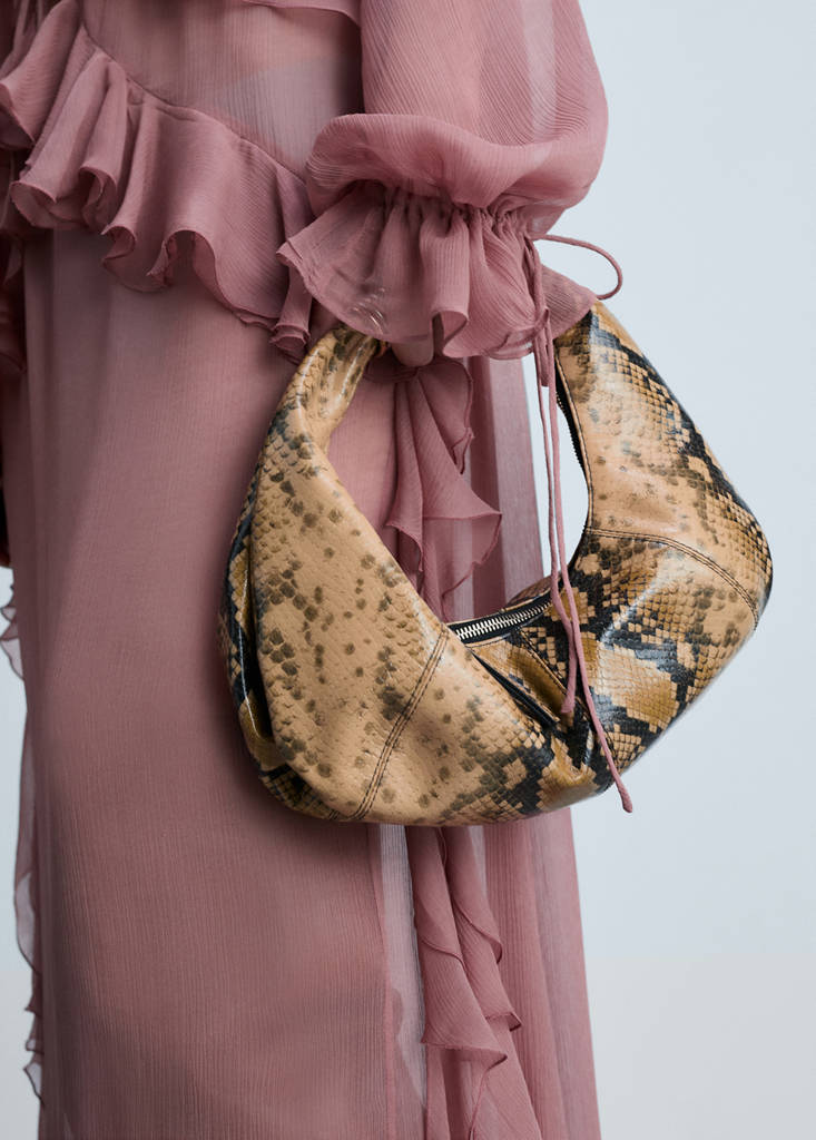 100% sheepskin. Small size. Snake effect. Shoulder strap. Integrated handle. Zip fastening. Metallic detail. Animal print