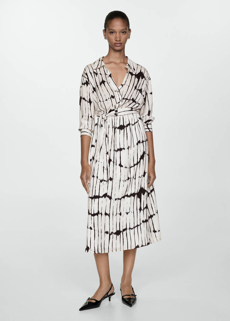 Fluid fabric. Midi design. A-line design. Shirt collar. Long sleeves with buttoned cuffs. Removable belt. Belt loops. Button fastening at the front. Printed design